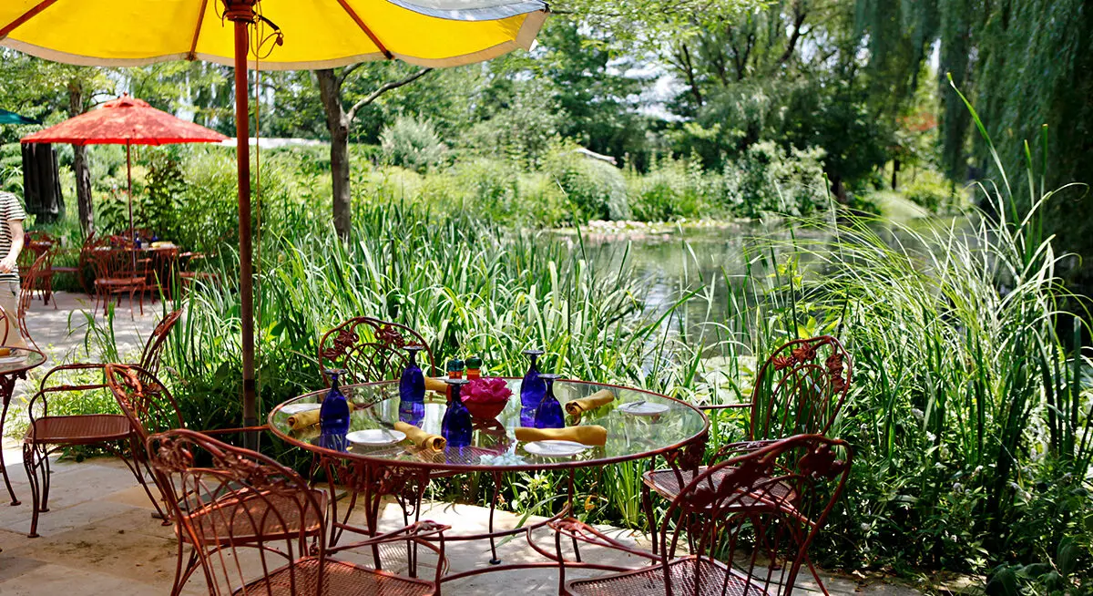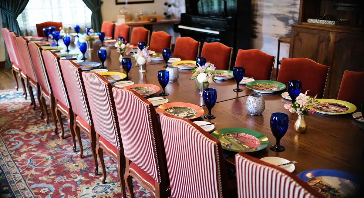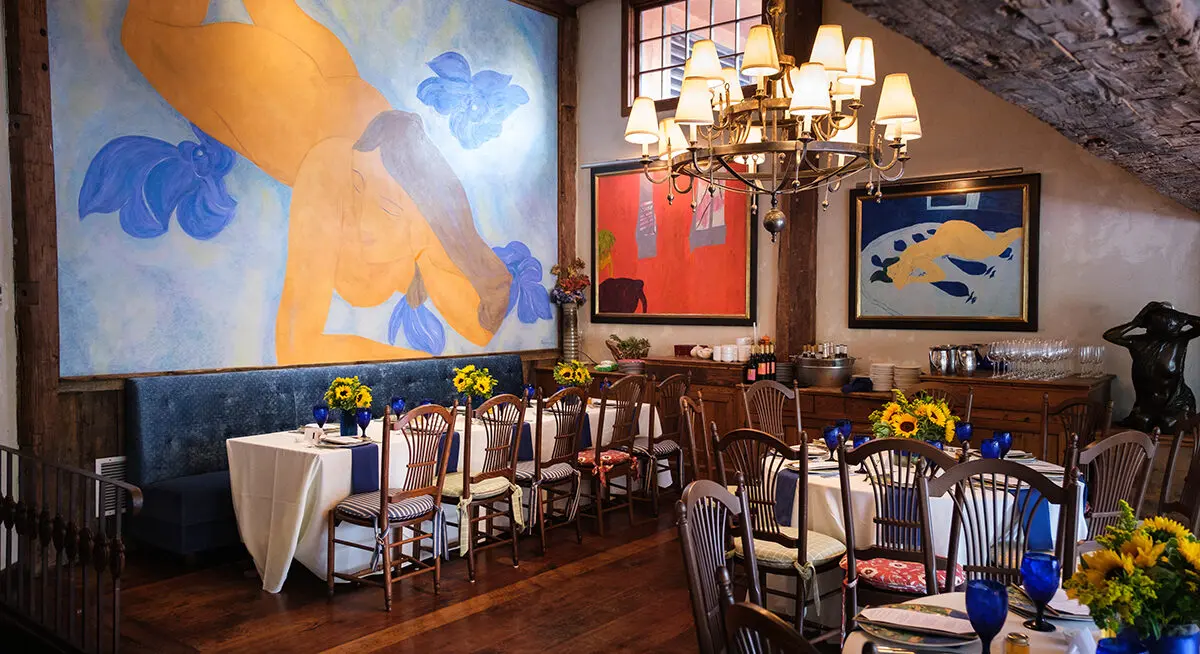 Expansive state-of-the-art space brimming with art and overlooking the “secret hedge-rooms.”